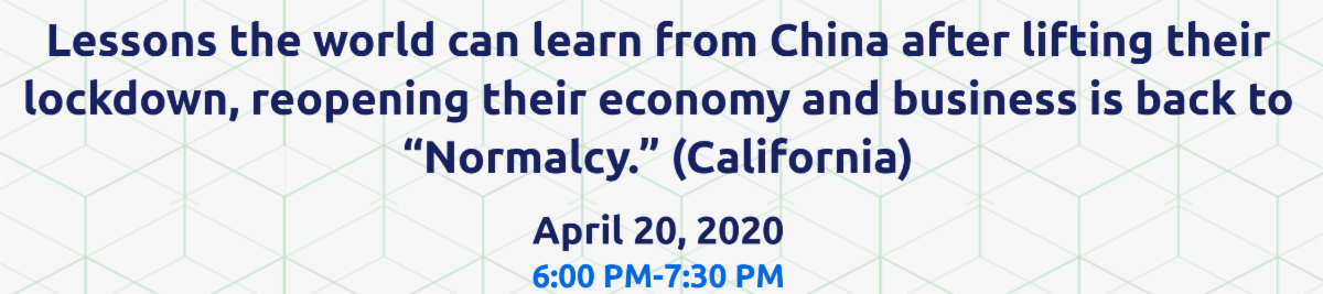 Lessons the world can learn from China after lifting their lockdown, reopening their economy and business is back to “Normalcy.” (California) Leave a comment Event Flyer RSVP Link https://bit.ly/20April20 Date/Time Date(s) - April 20, 20206:00 pm - 7:30 pm