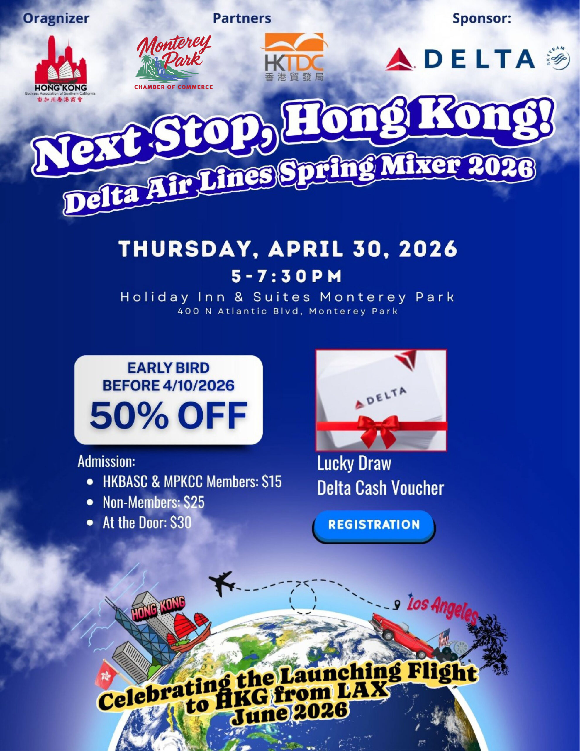 Get ready for an amazing time at the Delta Air Lines Spring Mixer 2026. Join us to celebrate the new LAX–HKG route! Enjoy delicious food and drinks, great company with HKBASC, and exciting lucky draw prizes including Delta Air Lines cash vouchers.