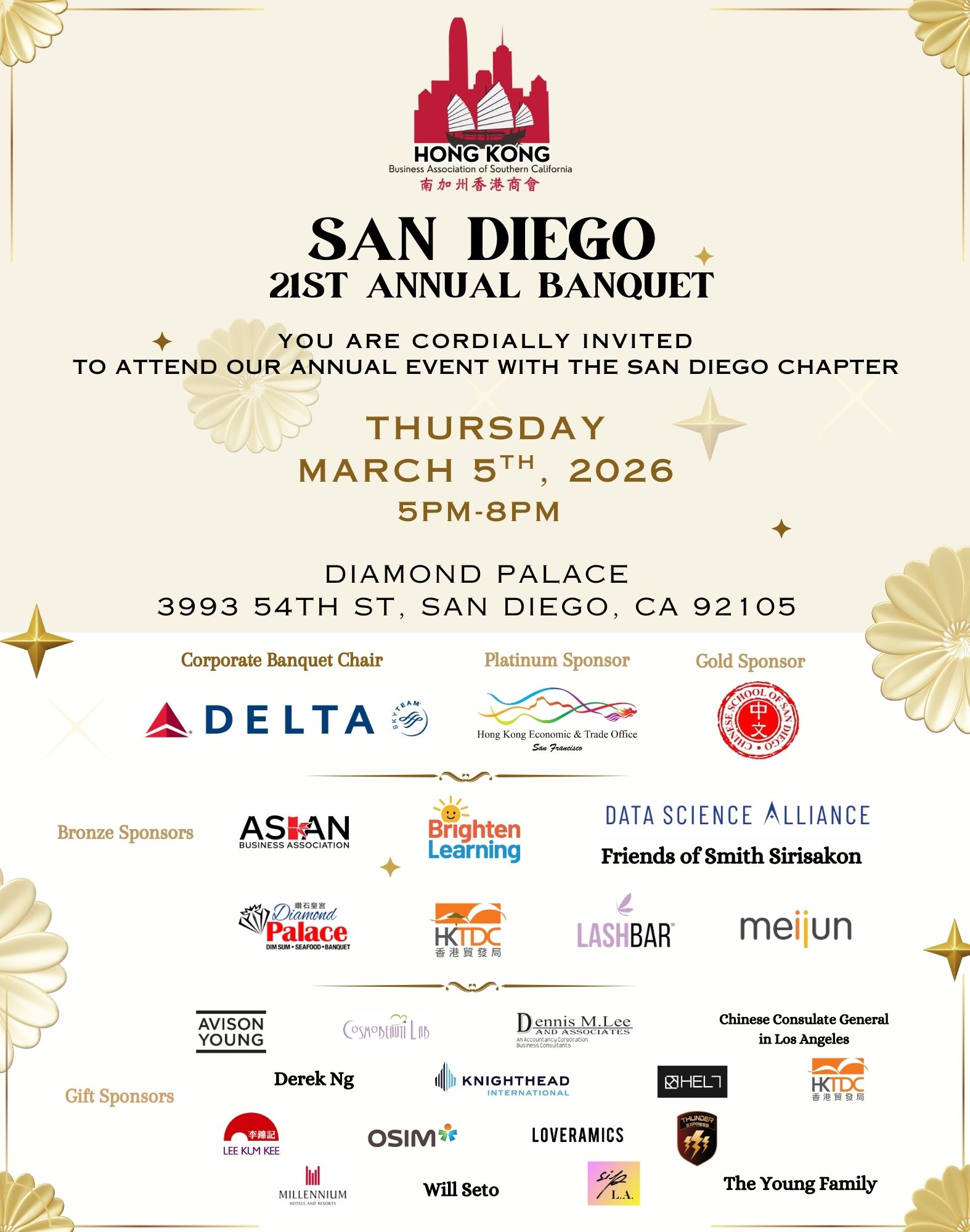 HKBASC is pleased to invite you to join us for a special evening with our San Diego Chapter as we host the 21st Annual Banquet. Building on the great energy and success of last year’s celebration, this year’s banquet brings us together once again to reconnect, celebrate our community, and strengthen the bonds within the HKBASC family.